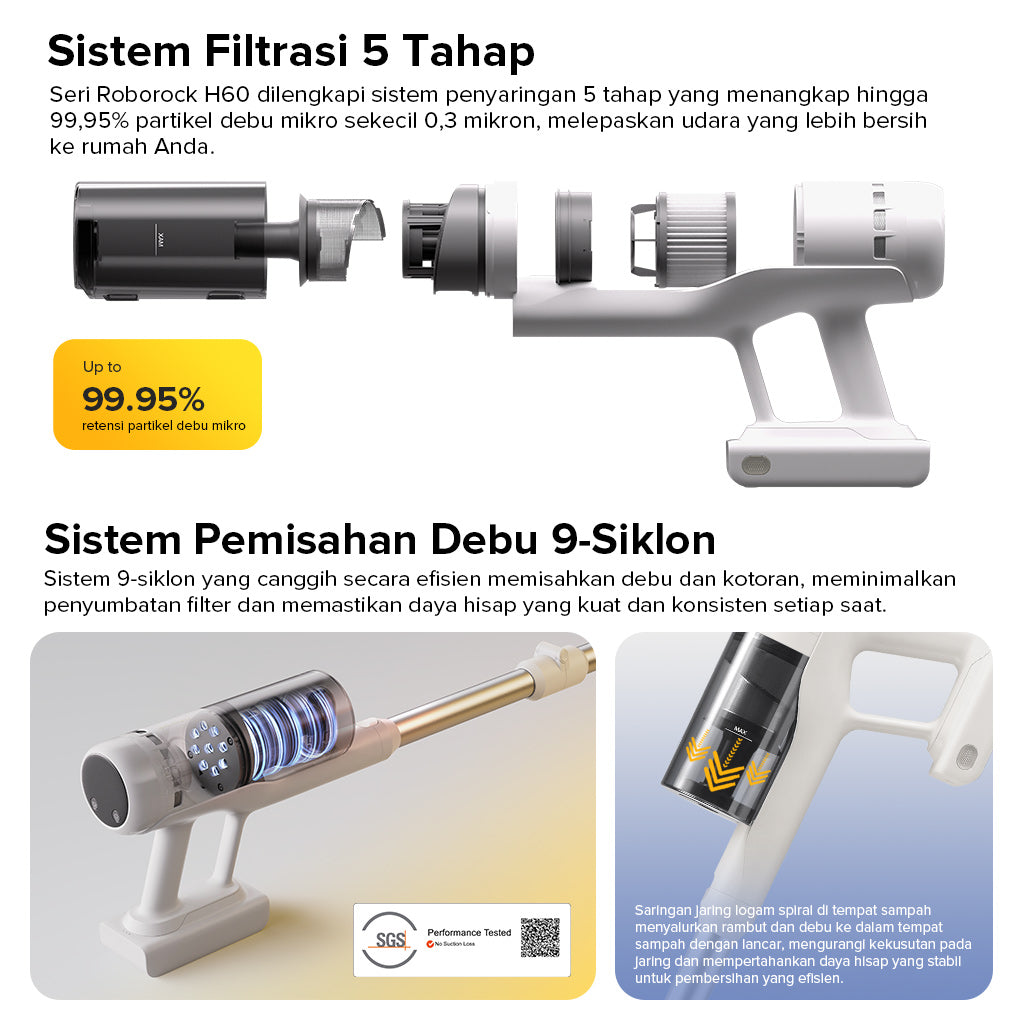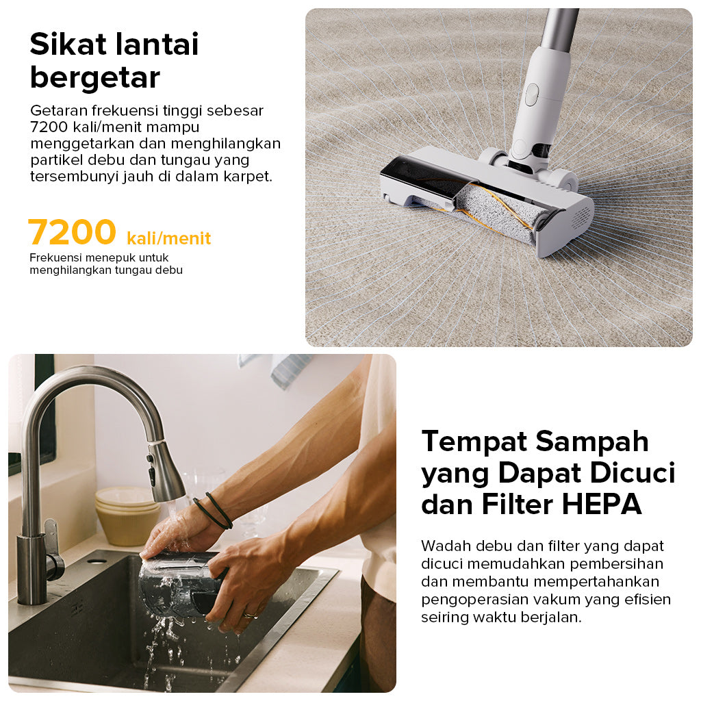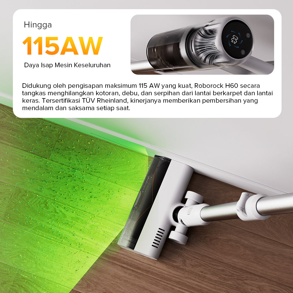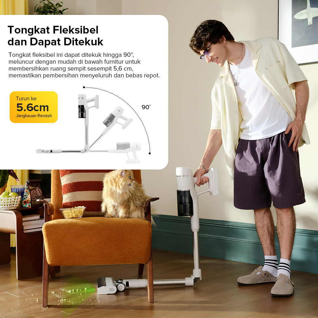 Bersihkan lebih dalam dengan daya hisap hingga 115AW, pegangan fleksibel eksklusif, dan sikat anti-kusut untuk karpet dan lantai keras. Sistem penyaringan 5 tahap menangkap 99,95% debu halus, sementara lampu hijau LED menyingkap kotoran tersembunyi. Dengan baterai yang dapat dilepas yang memberikan waktu pengoperasian hingga 60 menit dan beberapa alat yang disertakan, alat ini dibuat untuk pembersihan seluruh rumah yang ramah hewan peliharaan.