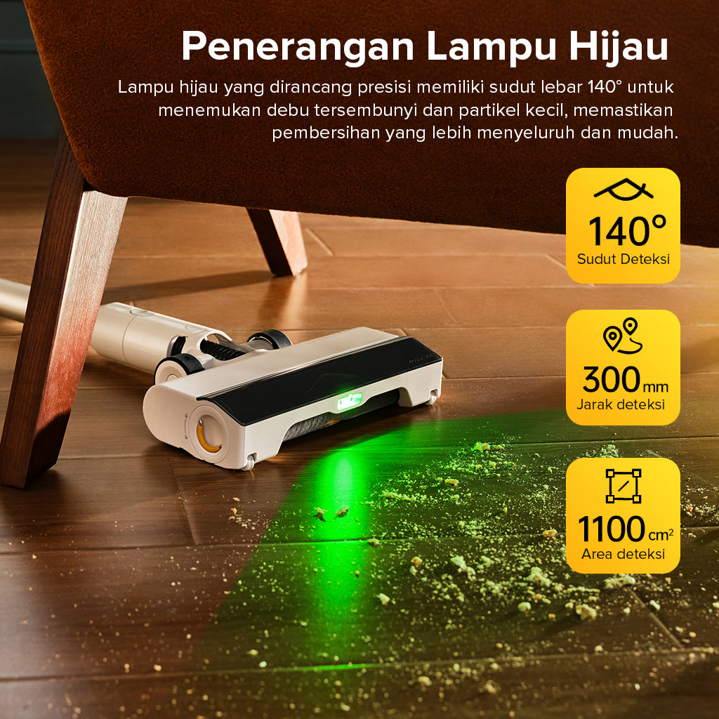 �� Teknologi Deteksi Debu dengan Lampu Hijau LED Visibilitas Debu yang Ditingkatkan: Lampu hijau LED memperkuat debu yang tersembunyi, membuatnya terlihat oleh mata telanjang, memastikan tidak ada debu yang tertinggal dan memungkinkan pembersihan yang mendalam. ��Sudut Ultra Lebar 140°: Lampu hijau besar di bagian tengah memberikan pandangan jelas ke area di depan, sehingga Anda dapat melihat partikel terkecil sekalipun untuk pembersihan menyeluruh.