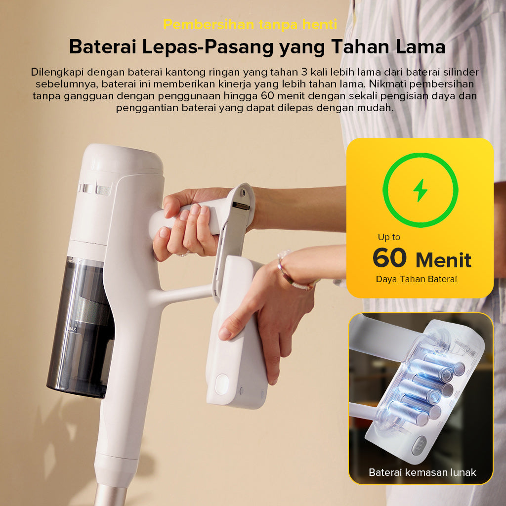 �� Baterai polimer litium-ion berkapasitas tinggi, mudah dilepas dan diisi ulang untuk penggunaan jangka panjang, menghasilkan pembersihan berkelanjutan hingga 60 menit dalam mode ECO dengan sikat celah 2-in-1.