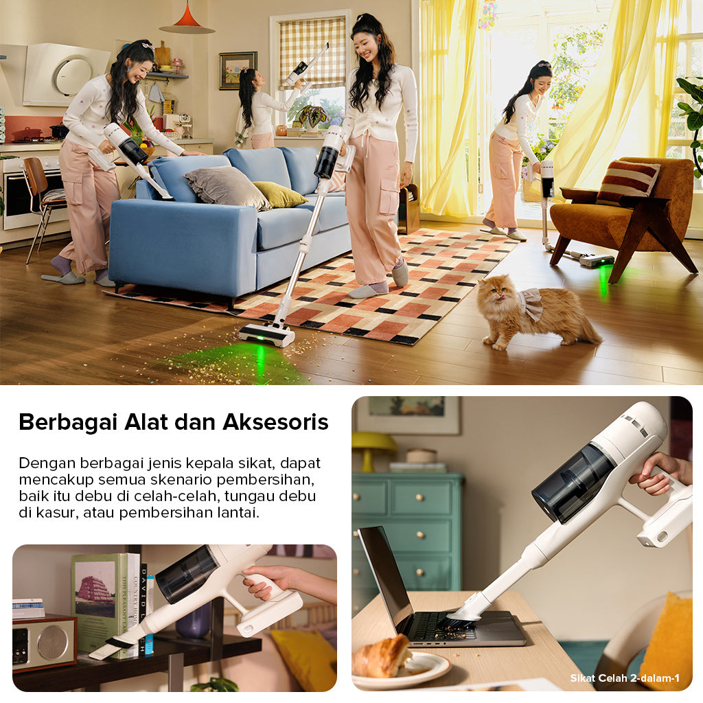 �� Penyedot debu genggam dengan beberapa kepala pembersih, termasuk sikat anti-kusut untuk lantai dan karpet, dan sikat celah 2-in-1.