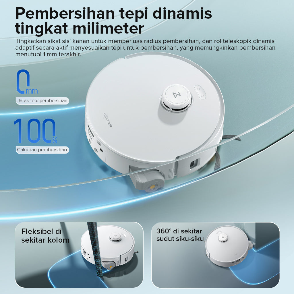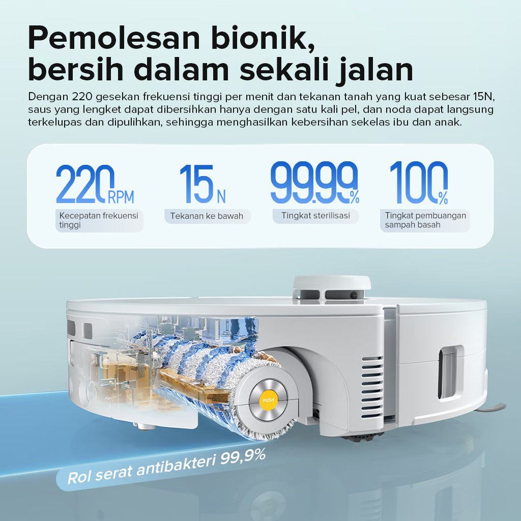 Untuk tumpahan cairan, robot akan beralih ke mode pel semata, mengangkat sikat utama dan samping untuk mencegah kontaminasi silang. Dari debu halus hingga noda membandel — robot selalu memilih strategi pembersihan paling efektif.