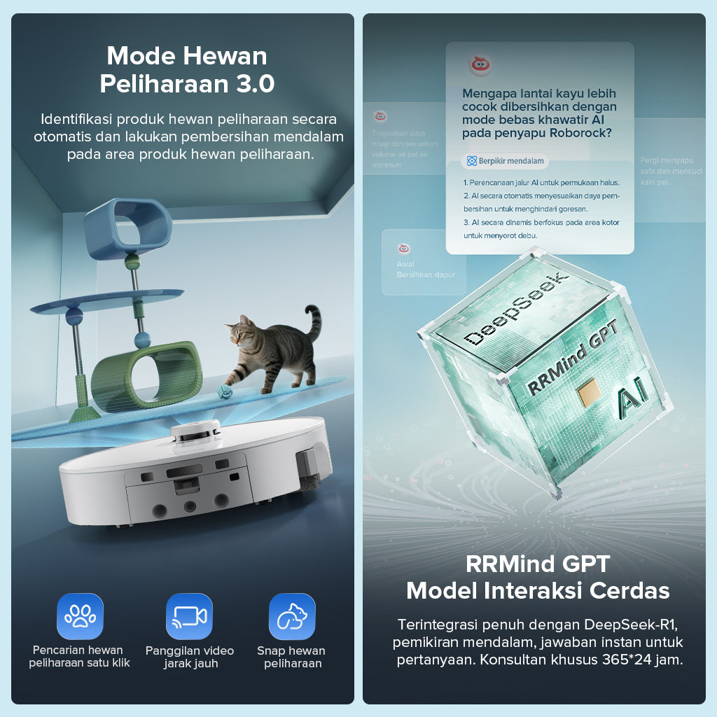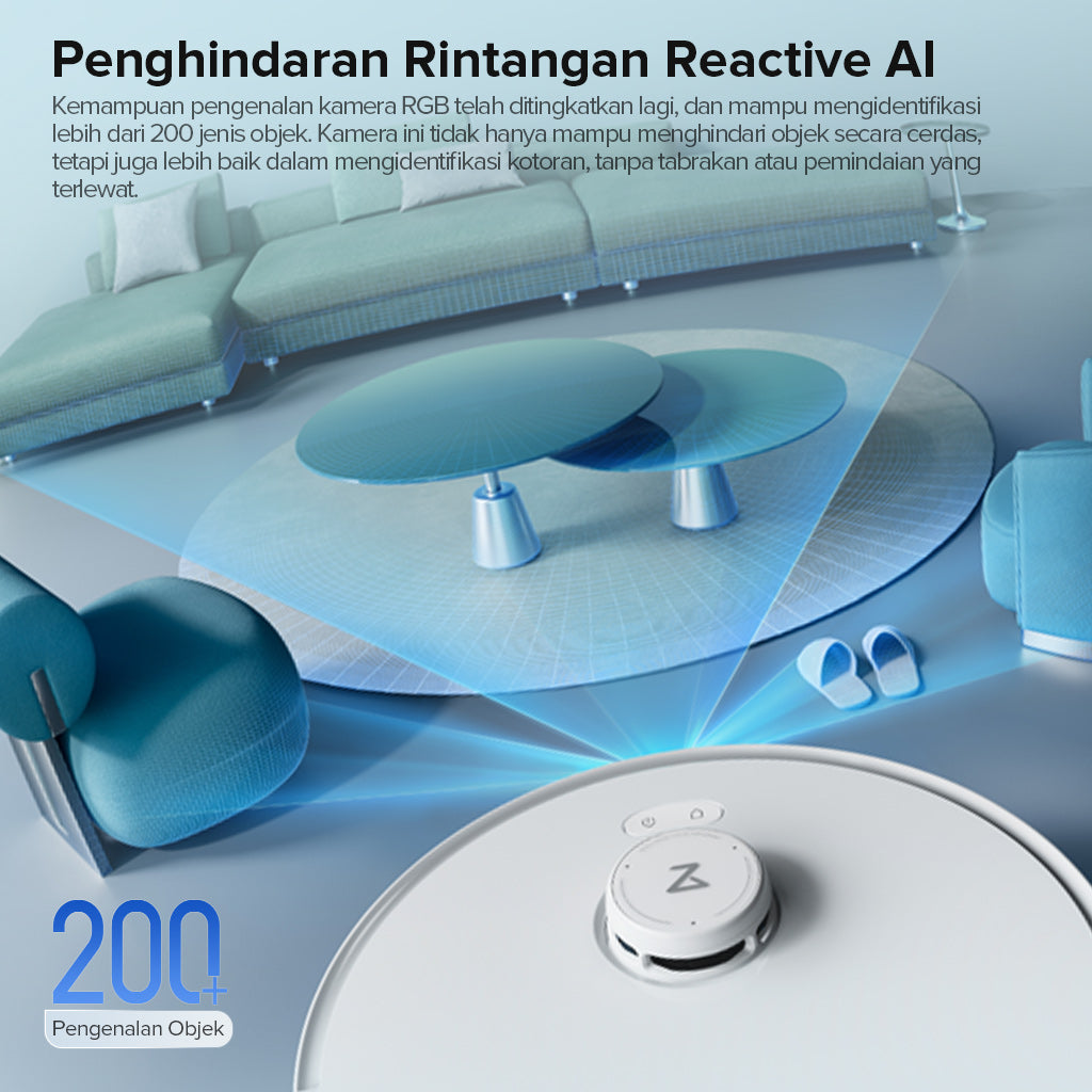 Dengan teknologi structured light dan kamera RGB, robot mampu mengenali dan menghindari lebih dari 200 jenis rintangan — mulai dari kabel, mainan hewan peliharaan, hingga benda kecil — bahkan dalam kondisi cahaya rendah.