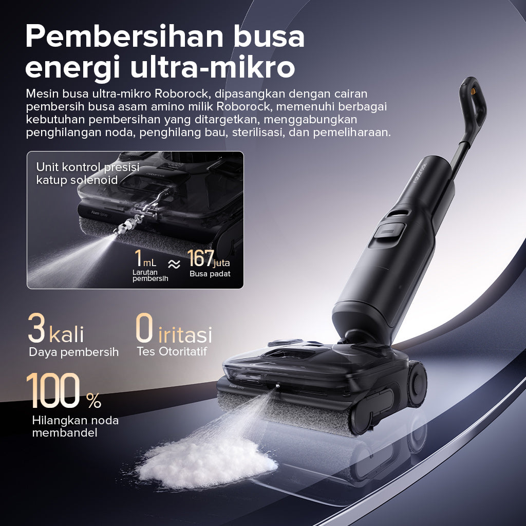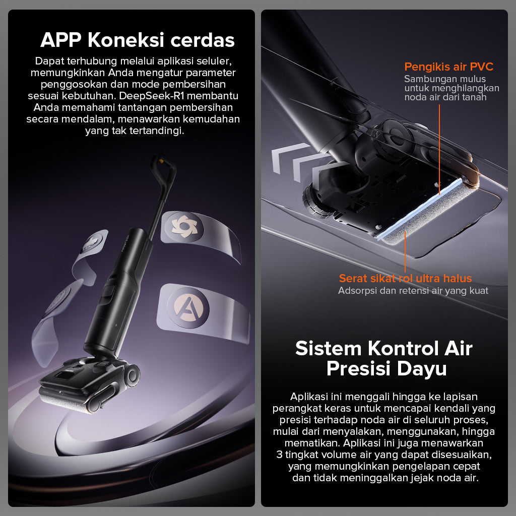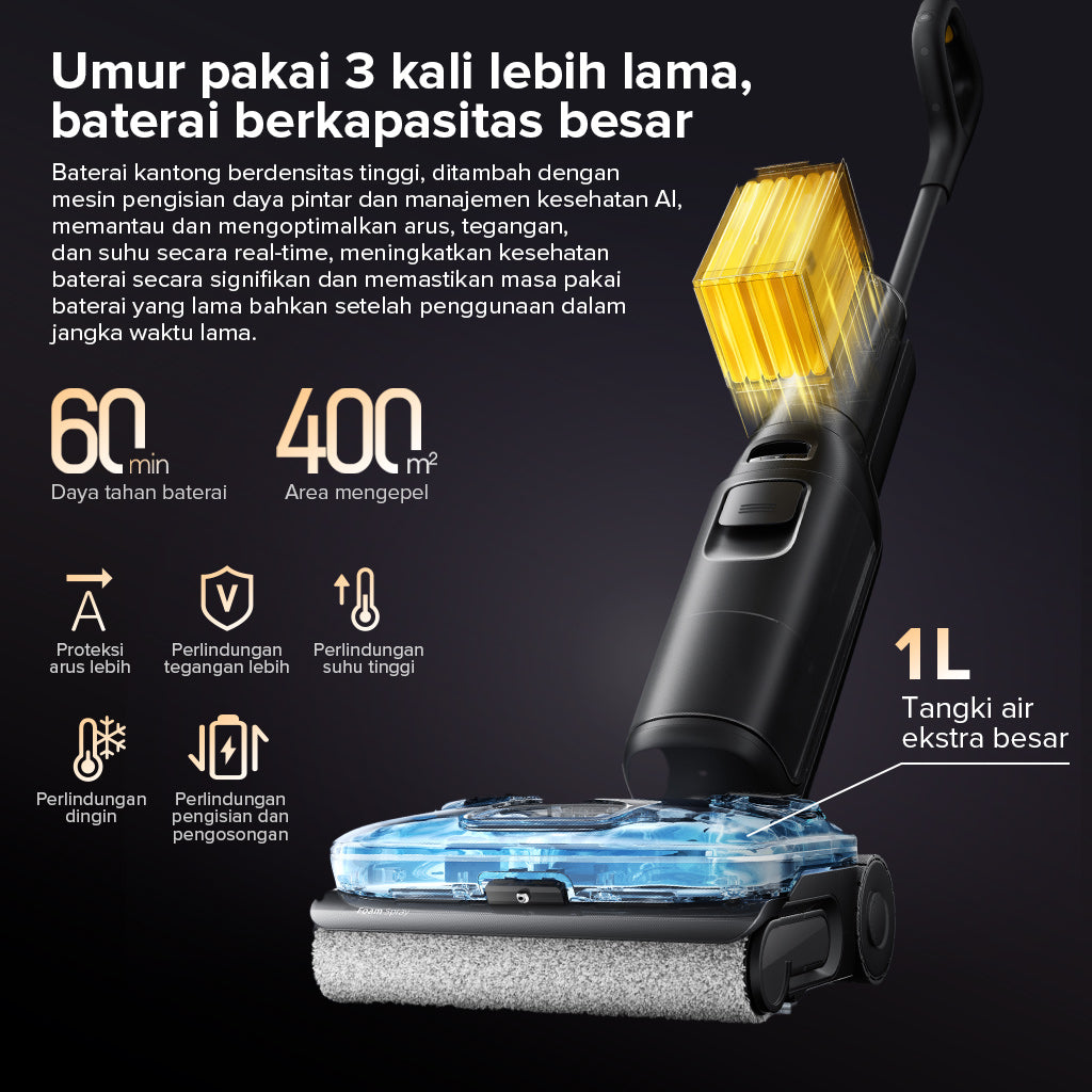 Fitur pintar seperti DirTect sensing, SlideTech 2.0, dan Auto Detergent Dispenser beradaptasi otomatis. Baterai lepas-pasang tahan hingga 60 menit.