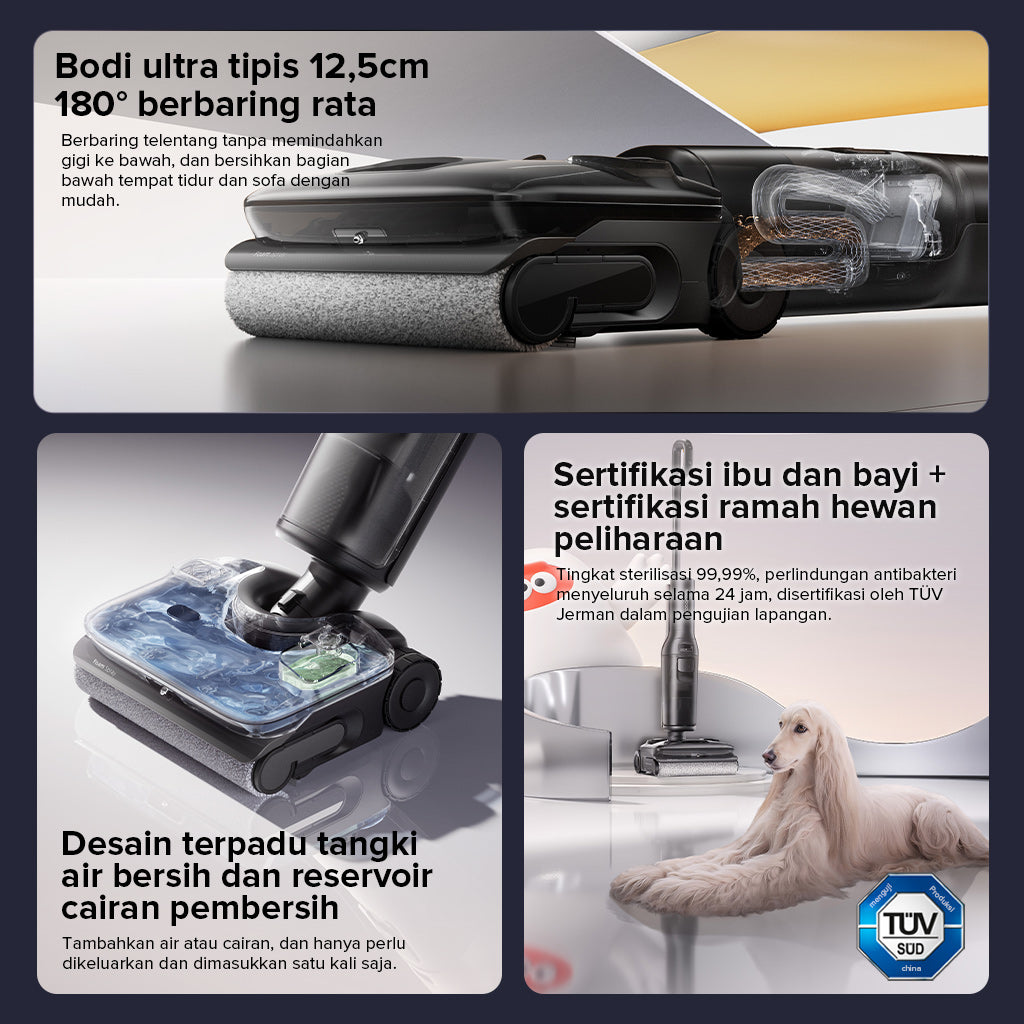 Deep clean dengan daya hisap hingga 25000 Pa, steam 180°C, serta 95°C High-Temperature Self-Cleaning. Roller anti kusut JawScrapers, desain FlatReach 2.0, dan Edge to Edge Cleaning membersihkan secara menyeluruh.